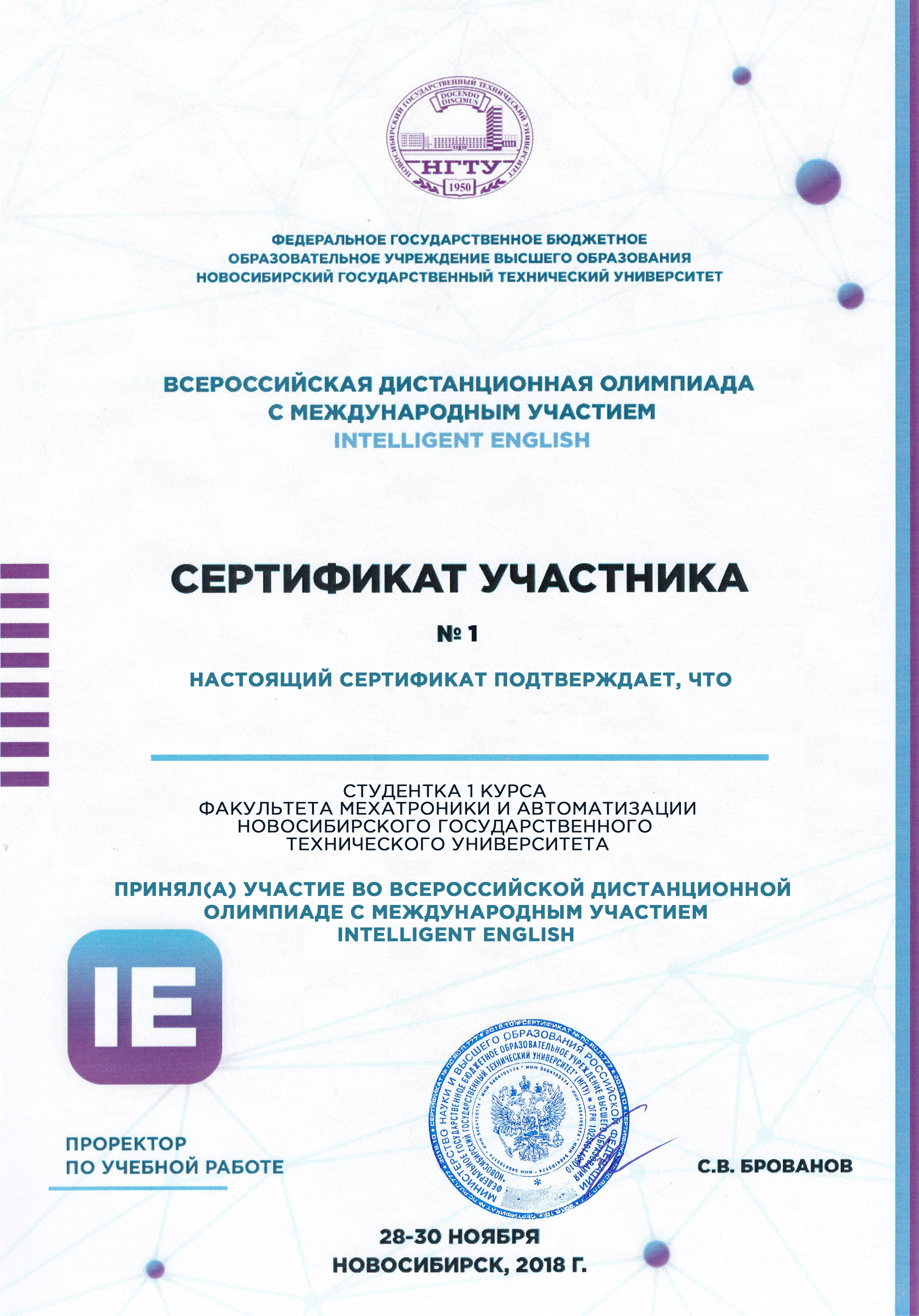 28-30 ноября 2018 г в Новосибирском государственном техническом вузе состоялась Всероссийская дистанционная олимпиада на английском языке с международным участием «Intelligent English» для студентов 1-2 курсов технических направлений подготовки.