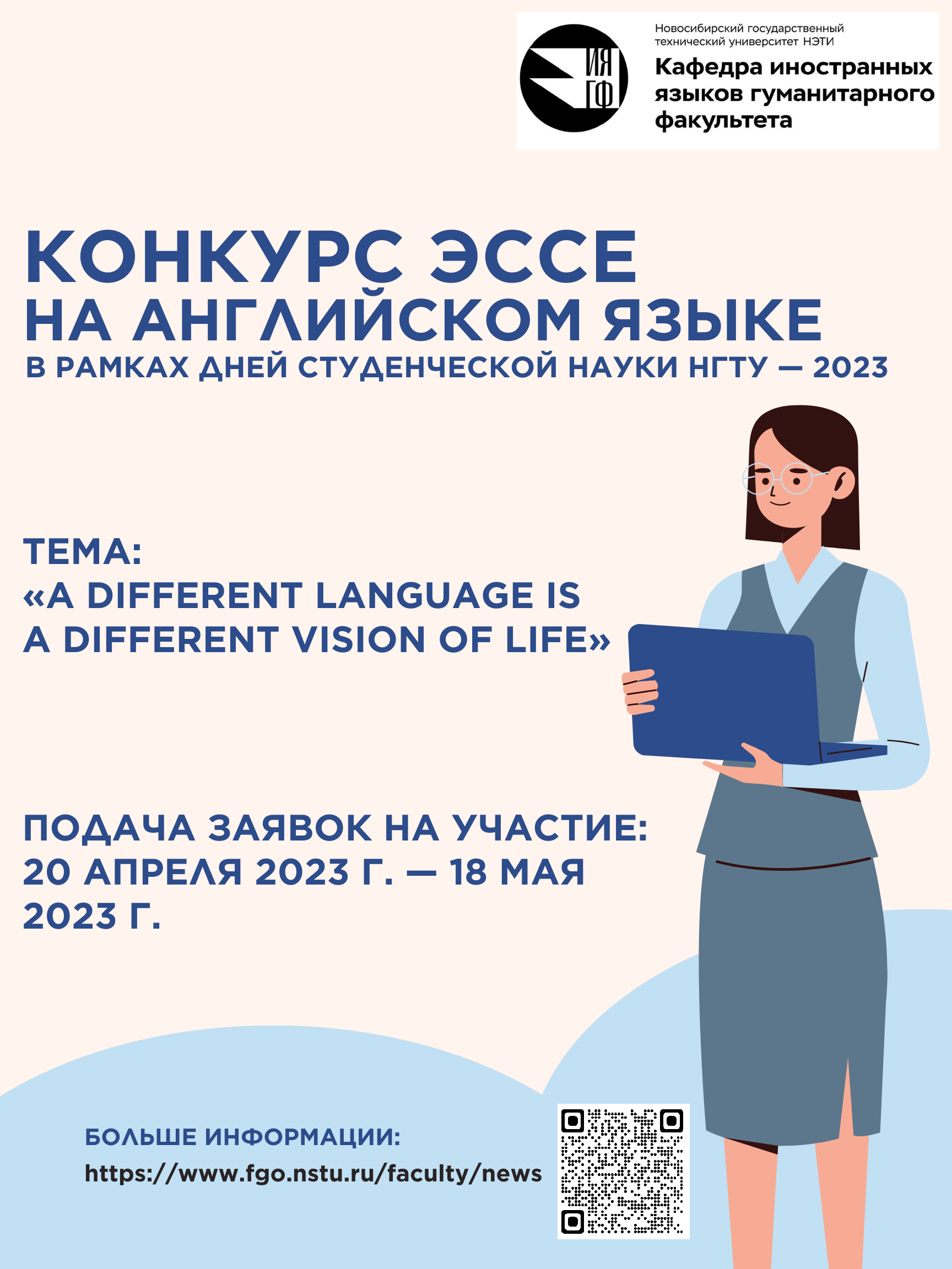 Кафедра иностранных языков гуманитарного факультета НГТУ приглашает студентов НГТУ всех курсов и направлений подготовки принять участие в Конкурсе эссе на английском языке на тему «A DIFFERENT LANGUAGE IS A DIFFERENT VISION OF LIFE» в рамках Дней студенческой науки НГТУ.