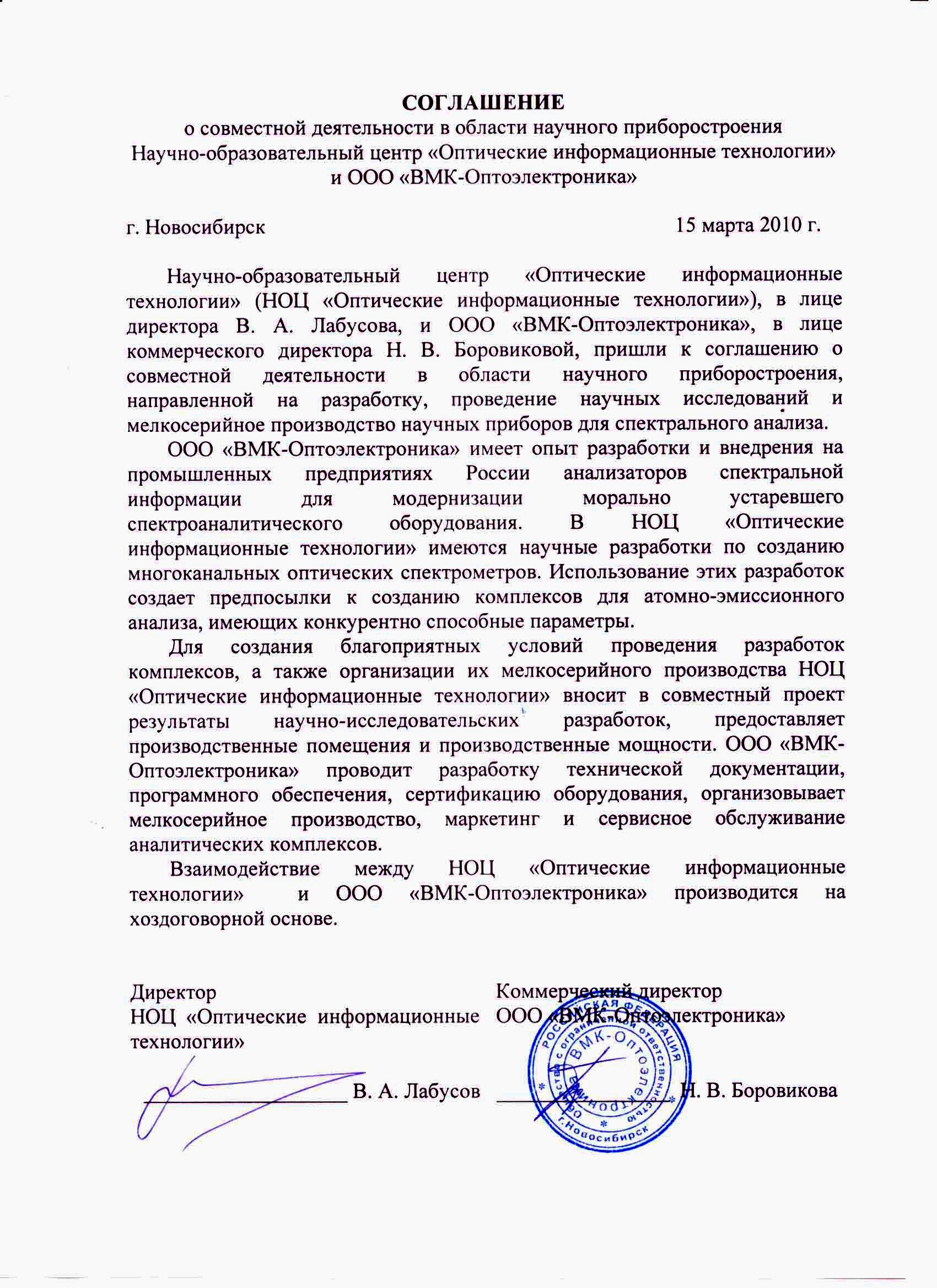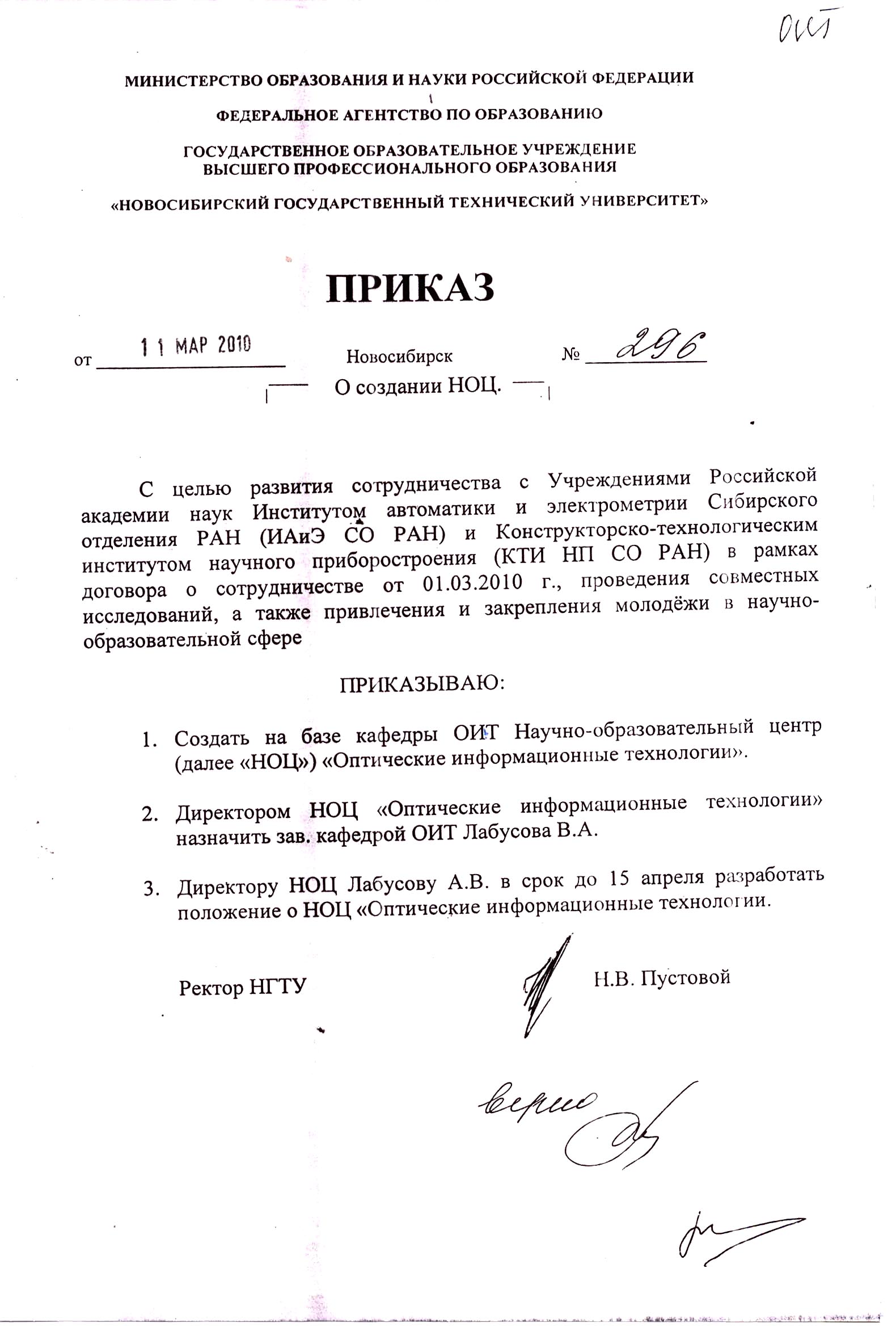 В 2010 году на базе кафедры создан Научно-образовательный центр (НОЦ) «Оптические информационные технологии» с целью повышения эффективности подготовки научных и научно-педагогических кадров, проведения научно-исследовательских работ, повышения качества образовательной деятельности, закрепления молодежи в сфере образования, науки и инноваций (Приказ НГТУ № 296 от 11.03.2010 г.).НОЦ организован на основании Договора о сотрудничестве от 01.03.2010г. между ИАиЭ СО РАН, КТИ НП СО РАН и НГТУ. Наряду с институтами СО РАН при проведении разработок и их внедрении в производство НОЦ сотрудничает с малыми инновационными предприятиями «ВМК-Оптоэлектроника» (соглашение НОЦ-ВМК) и «ПолигорН» (соглашение НОЦ-ПолигорН) Директором НОЦ является Лабусов В.А.