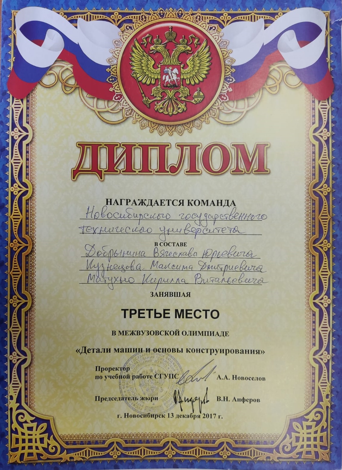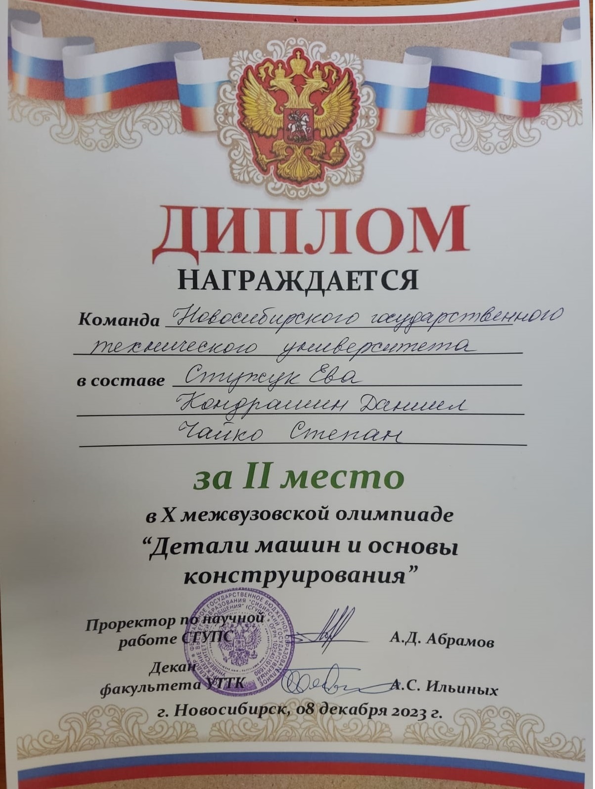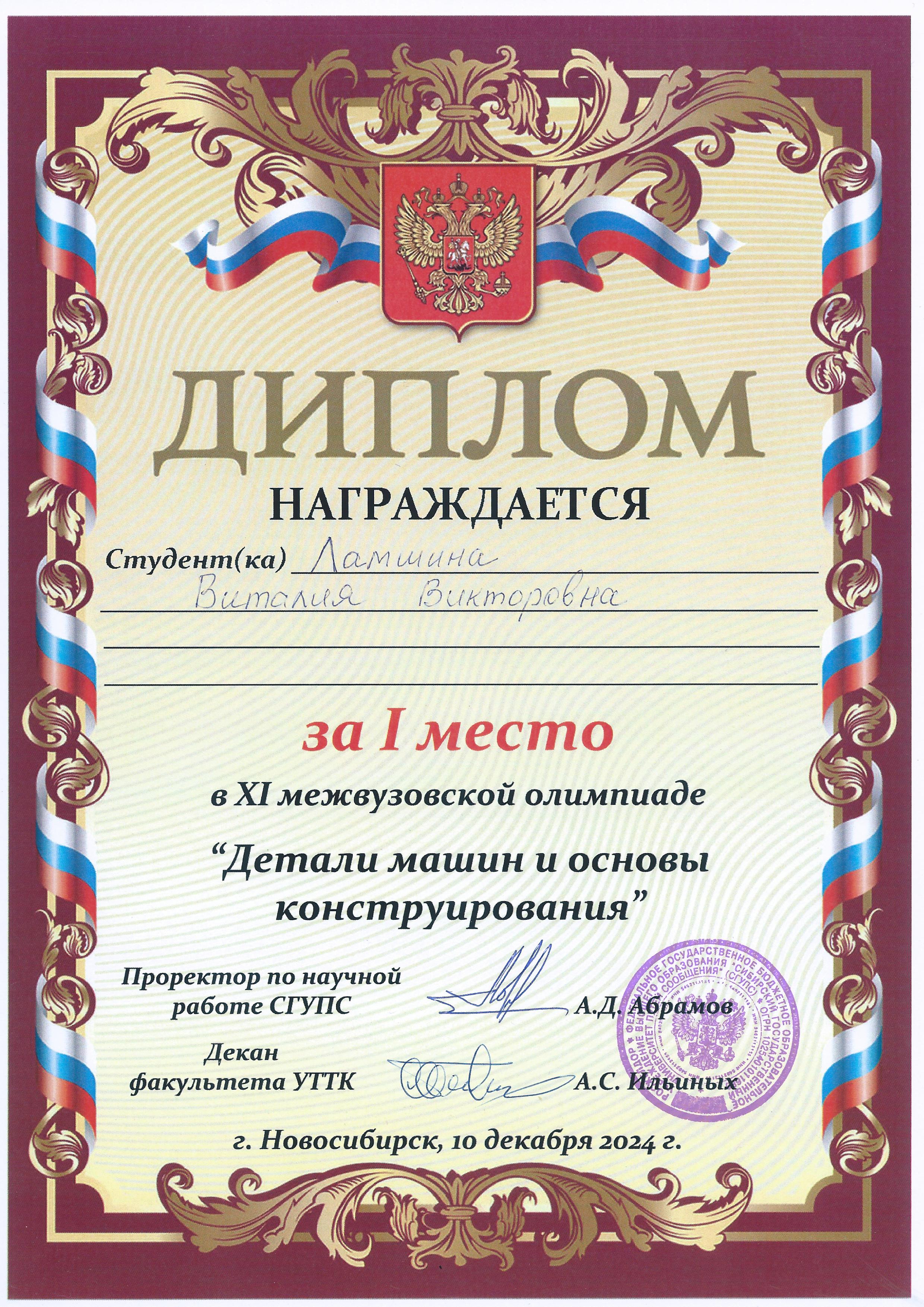 10 декабря 2024 года на межвузовской олимпиаде по Деталям машин и основам конструирования, которая проходила в Сибирском государственном университете путей сообщения (СГУПС) команда НГТУ из студентов 3 курса МТФ гр. КМ-122 в всоставе: Пушнина Вероника, Ламшина Виталия и Игуменов Сергей - заняла второе командное место, а также в личном зачете: Ламшина Виталия - первое, Пушнина Вероника - третье и Игуменов Сергей - четвертое места.