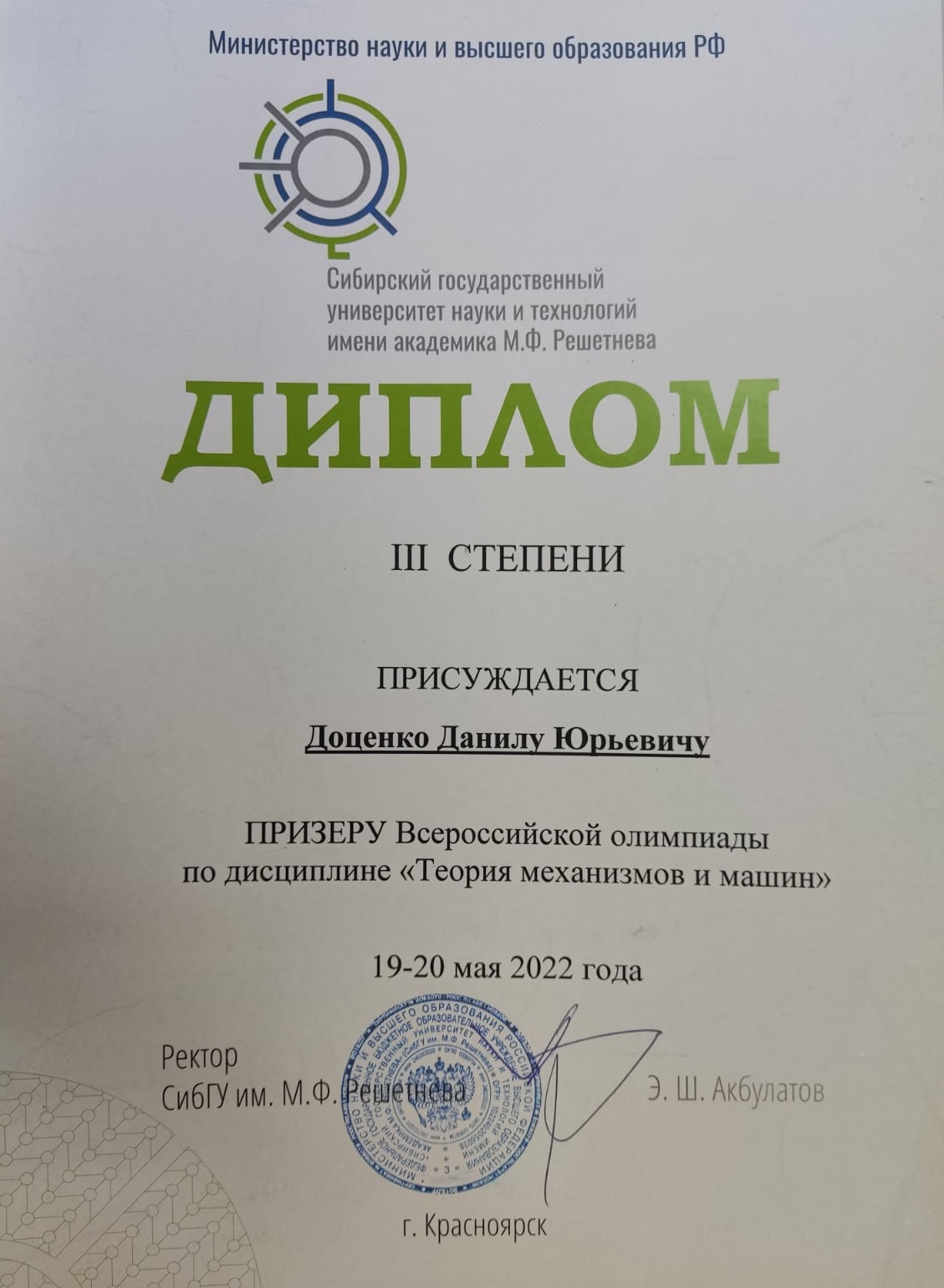 Студент второго курса МТФ гр. МтР-120 Доценко Данил занялл третье место во Всероссийской олимпиаде по дисциплине "Теория механизмов и машин", устроитель Сибирский государственнный университет науки и технологий имени академика М.Ф. Решетнева (г. Красноярск, 19-21 мая 2022 года).