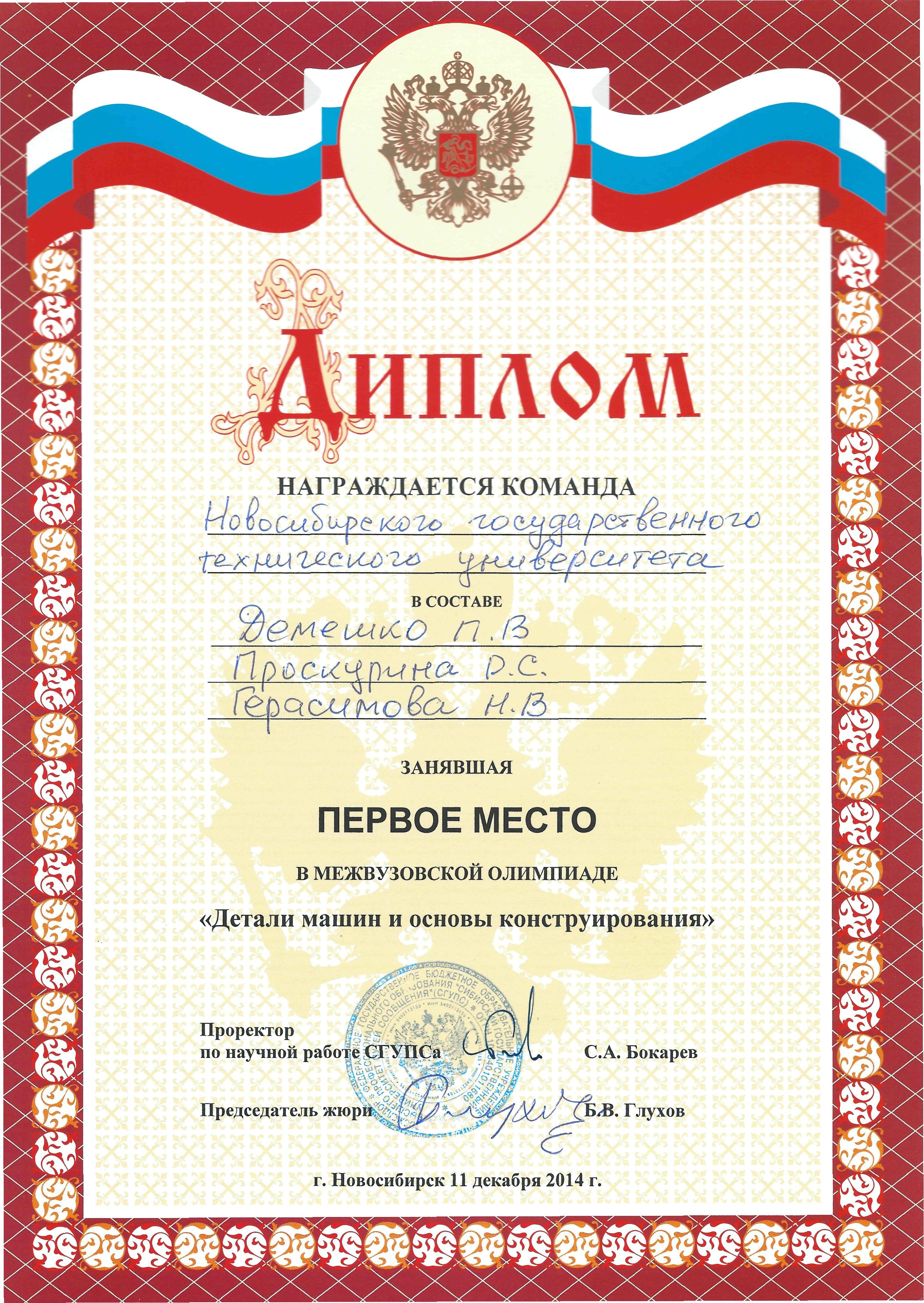 11 декабря 2014 года Команда Новосибирского государственного технического университета заняла первое место на городской межвузовской олимпиаде «Детали машин и основы конструирования», проходившей на кафедре «Подъемно-транспортные, путевые, строительные и дорожные машины» Сибирского государственного университета путей сообщения.