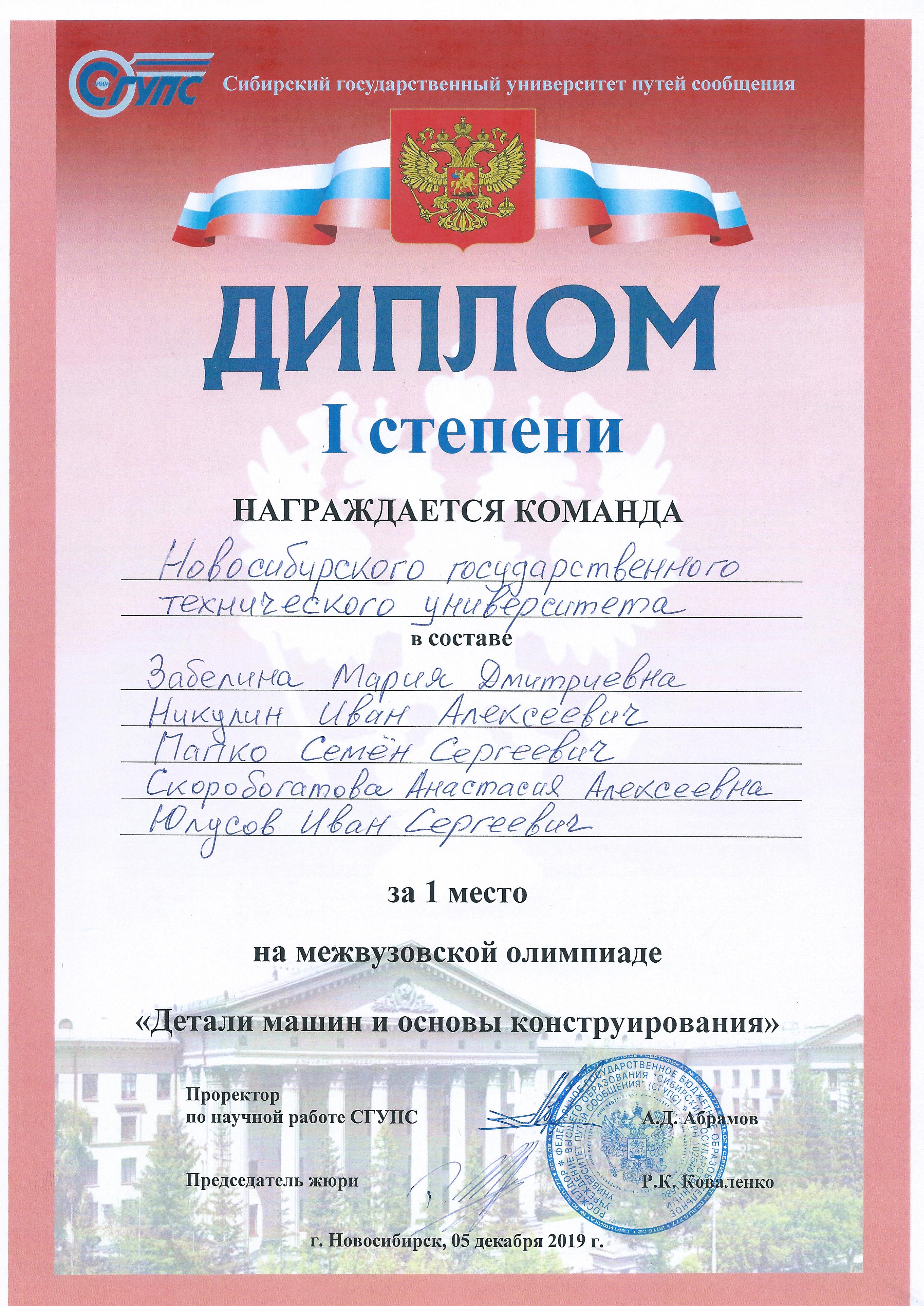 5 декабря 2019 года, команда Новосибирского государственного технического университета заняла первое место на городской межвузовской олимпиаде «Детали машин и основы конструирования», организованной на кафедре «Подъемно-транспортные, путевые, строительные и дорожные машины» Сибирского государственного университета путей сообщения.