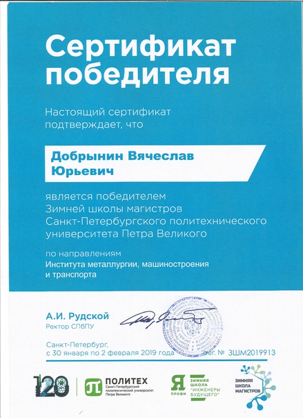 Победитель Добрынин Вячеслав, МТФ, гр. КП-501.
