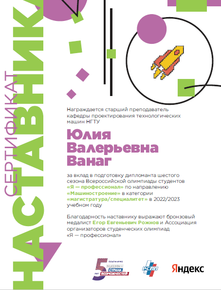 2022/2023 в шестом сезоне Всероссийской олимпиады студентов "Я - профессионал", 08 апреля 2023 года, в категории  "Магистратура/специалитет" по направлению "Машиностроение" Егор Рожнов (МТФ, Маг-621) стал бронзовым медалистом.