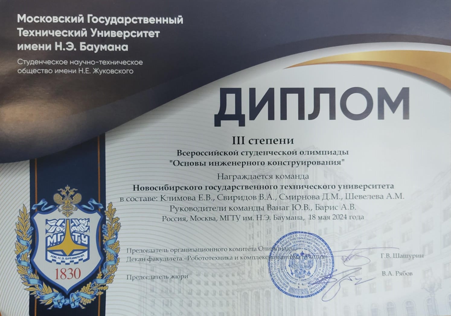 17 по 20 мая 2024 года в Московском государственном техническом университете имени Н.Э. Баумана состоялся III (Всероссийский) этап IX Всероссийской студенческой олимпиады «Основы инженерного конструирования».