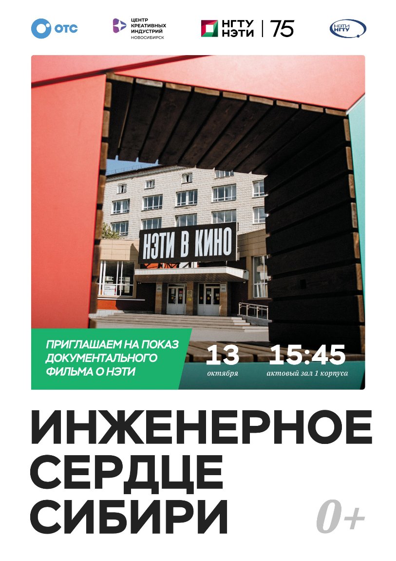 Одним из финальных аккордов празднования 75-летия Новосибирского государственного технического университета НЭТИ станет премьера фильма о вузе «Инженерное сердце Сибири». Премьерный показ пройдет 13 октября в актовом зале 1 корпуса НГТУ НЭТИ. Начало в 16:00.